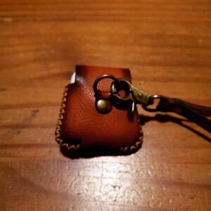 The distinguished leather pouch fits closely around the Airpods case.